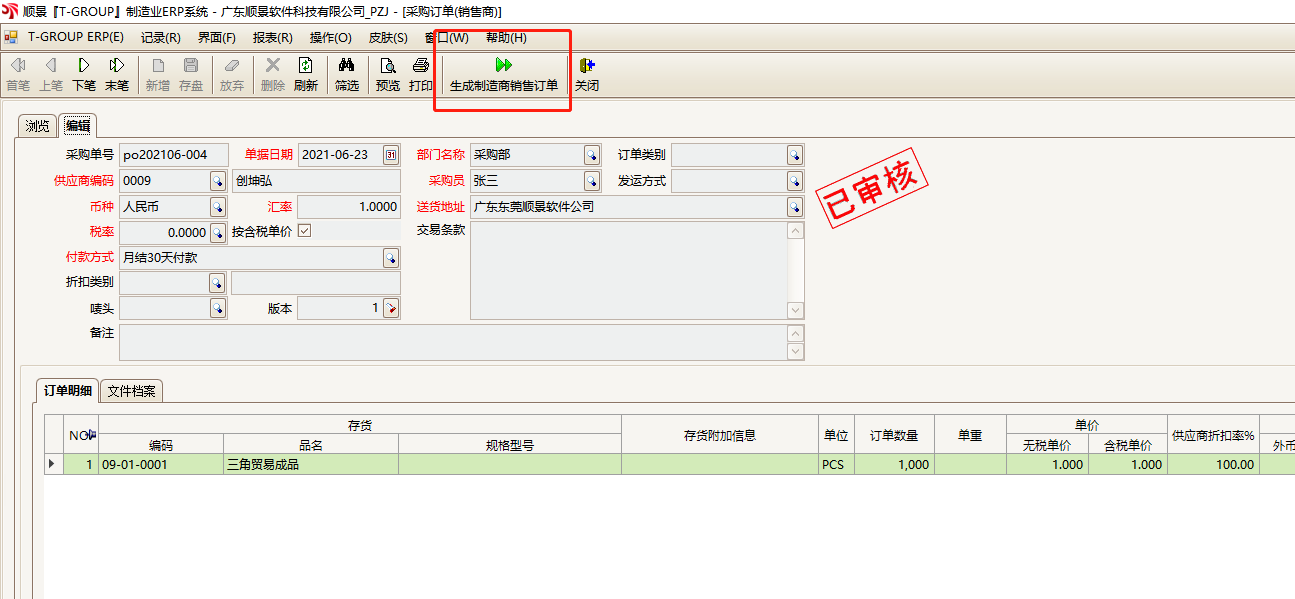 5.现在顺景ERP内就会自动在A公司库内生成一张采购订单。