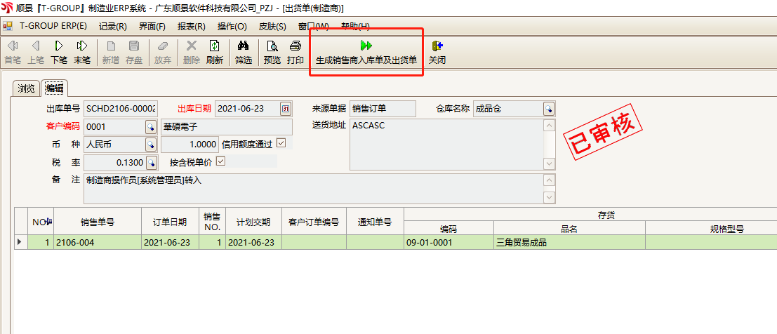 12. 选择该出货单,点击生成销售商入库单及出库单。